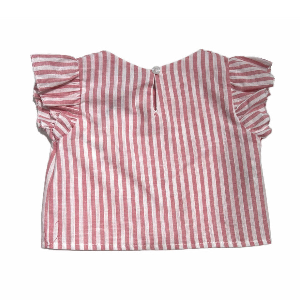 Questa blusa neonata è realizzata in lino e cotone, per garantire traspirabilità e freschezza. Il tessuto rigato aggiunge un tocco di stile, mentre il materiale naturale garantisce comfort e salute per la pelle della tua bambina. Un'ottima scelta per le giornate estive.