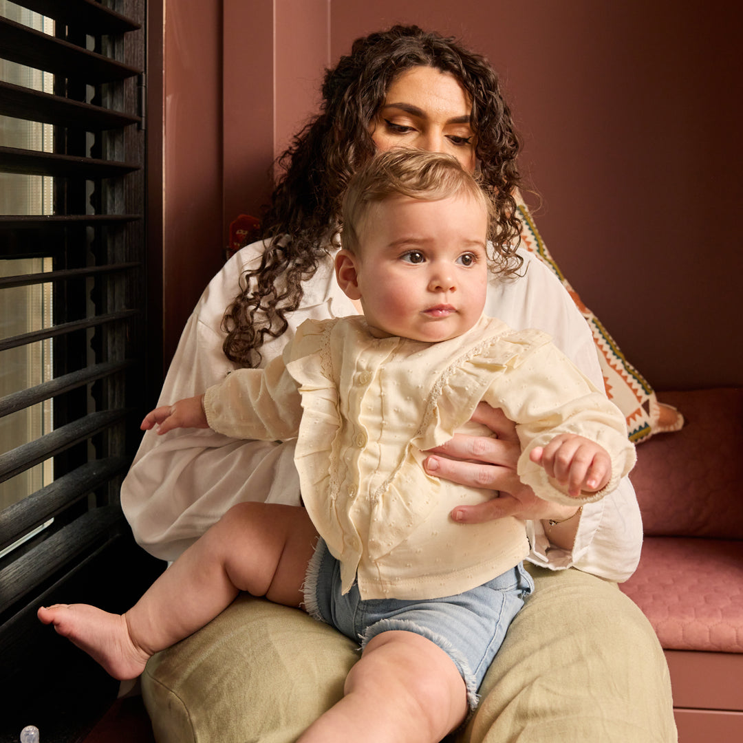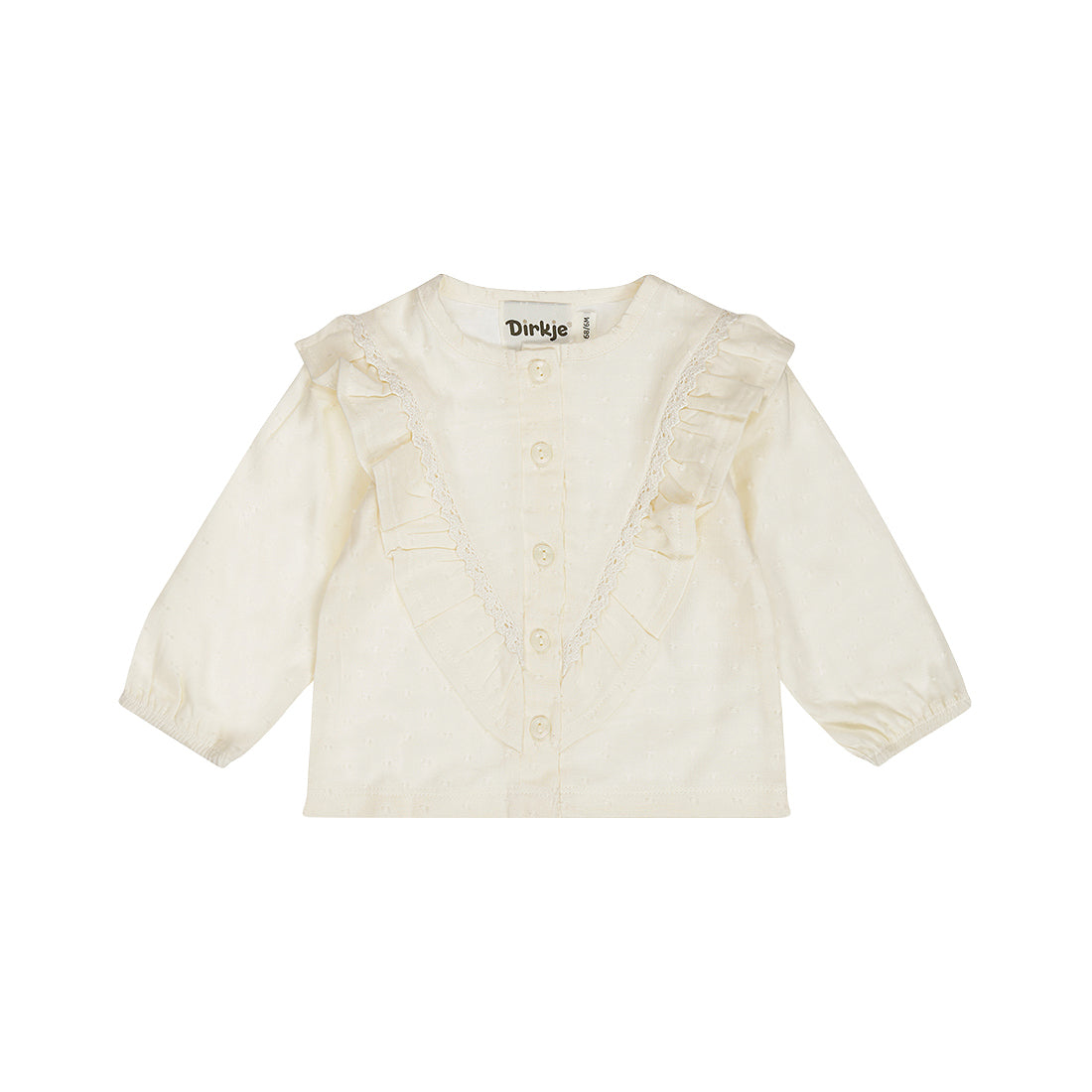 Delicata camicina neonata Dirkje con volant e pizzo Sangallo, perfetta per le prime settimane di vita. Il tessuto morbido e traspirante garantisce il massimo comfort, mentre i dettagli in pizzo ricamato aggiungono un tocco elegante e raffinato. La vestibilità ampia consente libertà di movimento e facilita il cambio. Ideale per occasioni speciali o uso quotidiano, questa camicina combina praticità e stile delicato per la tua piccola.