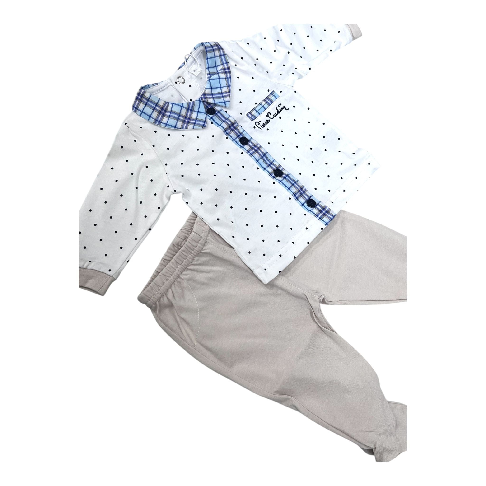 Tutina in due pezzi realizzata in cotone 100% puro, ideale per i neonati grazie alla morbidezza e traspirabilità del tessuto. Il design Pierre Cardin combina eleganza e praticità, con tagli comodi che permettono una vestizione facile durante i cambi frequenti. La composizione naturale protegge la pelle delicata del bambino, riducendo il rischio di irritazioni. Perfetta per l'uso quotidiano, offre libertà di movimento essenziale per lo sviluppo del neonato. Un capo versatile che mantiene il comfort durante tutto il giorno.