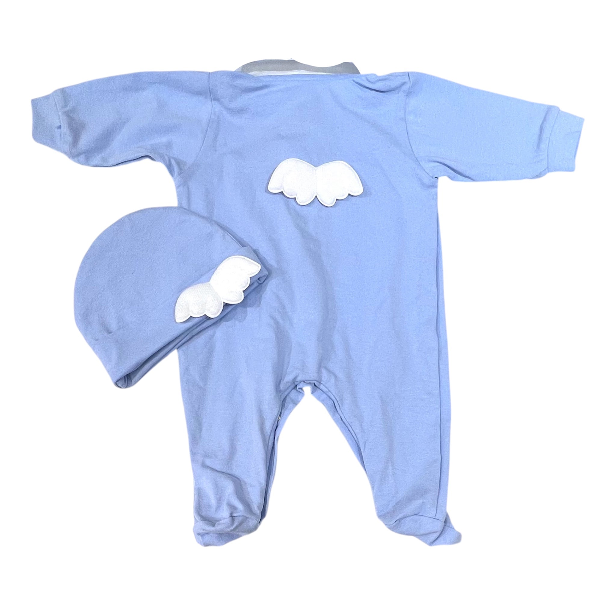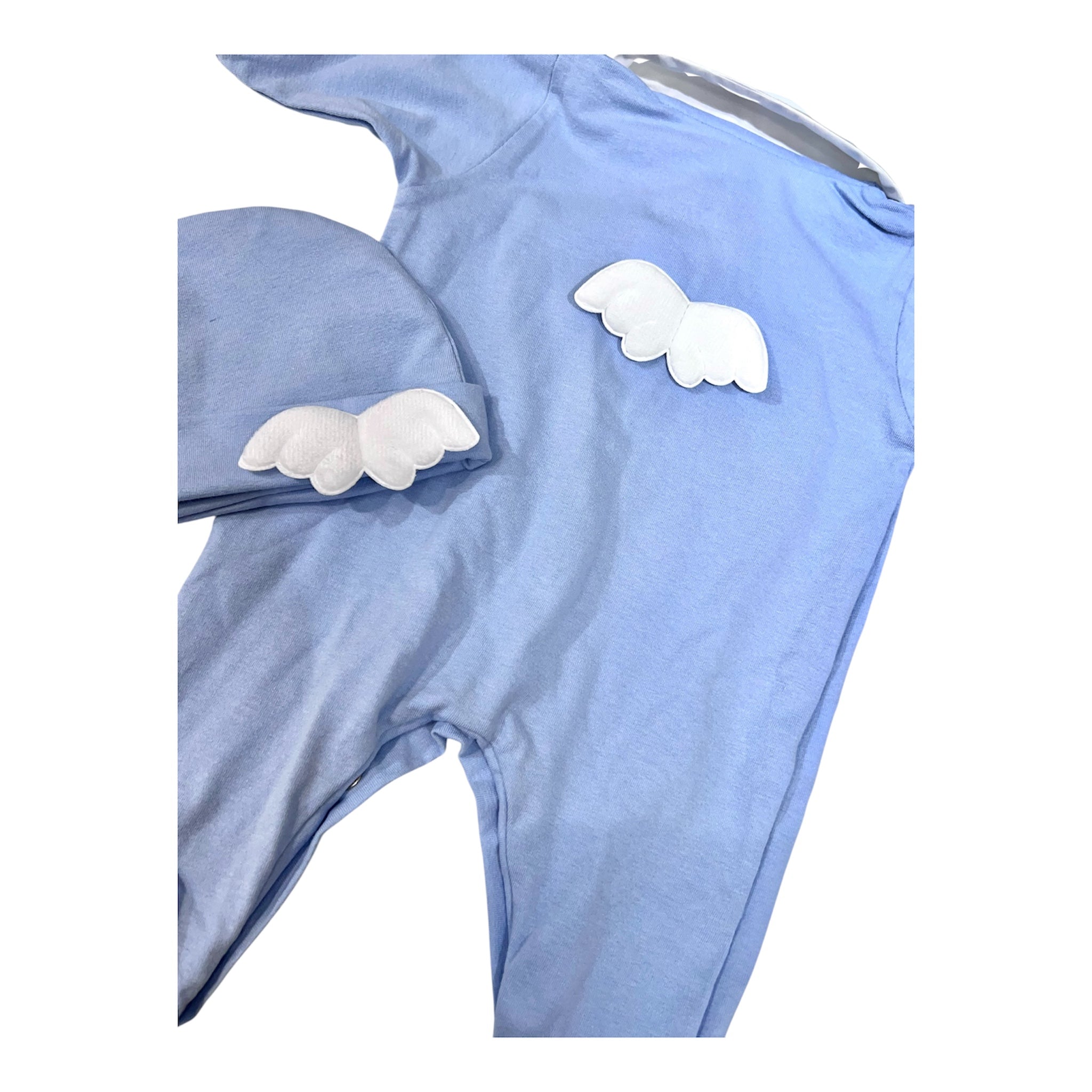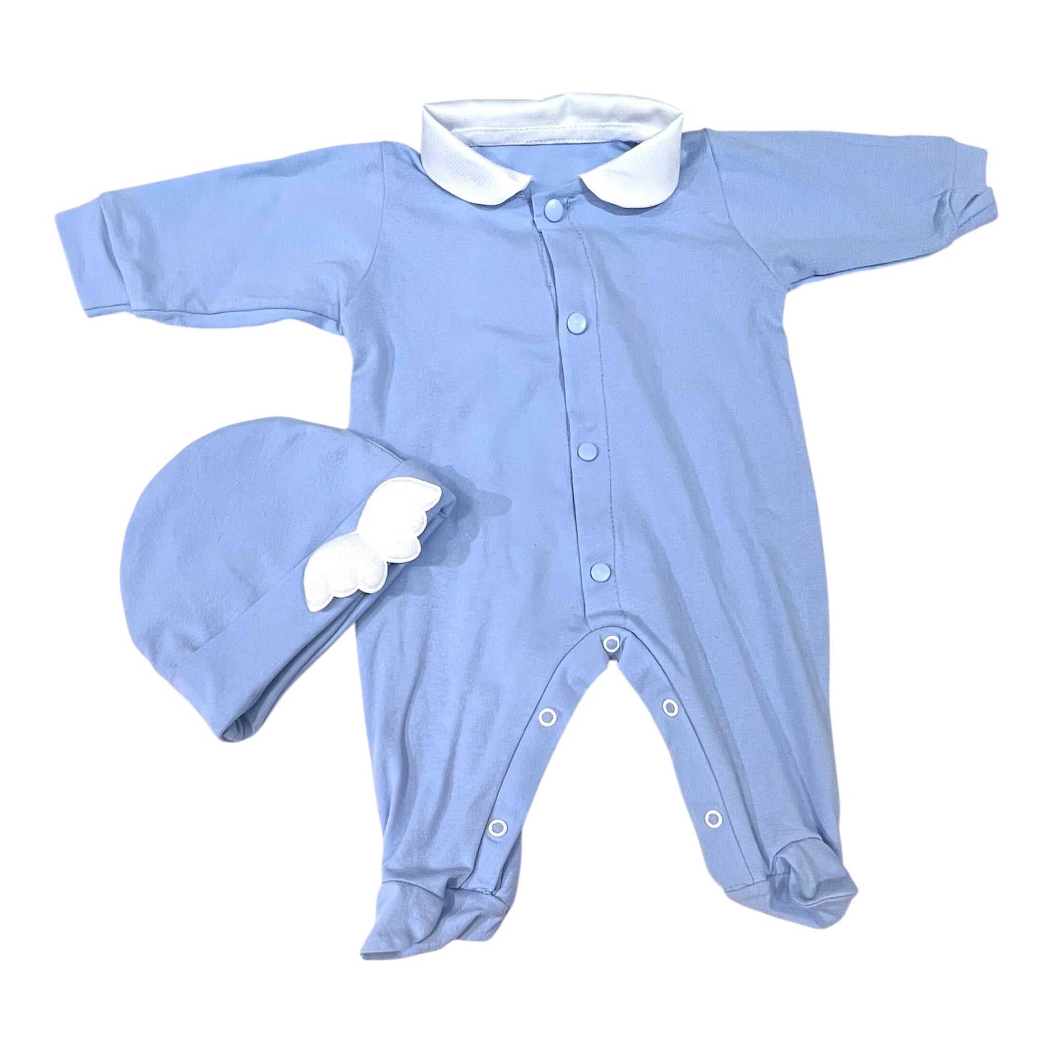 Set coordinato composto da tutina e cappello con ali decorative, pensato per arricchire il corredino neonato con eleganza. Il colletto in piquet conferisce un tocco sofisticato, mentre le ali applicate aggiungono un elemento giocoso e affettuoso. Confezionati in tessuti morbidi e traspiranti, questi capi garantiscono libertà di movimento e benessere termico. Ideali per fotografie ricordo o momenti speciali, rappresentano una scelta consapevole per chi ricerca qualità artigianale e design curato nei primi indumenti del bambino.